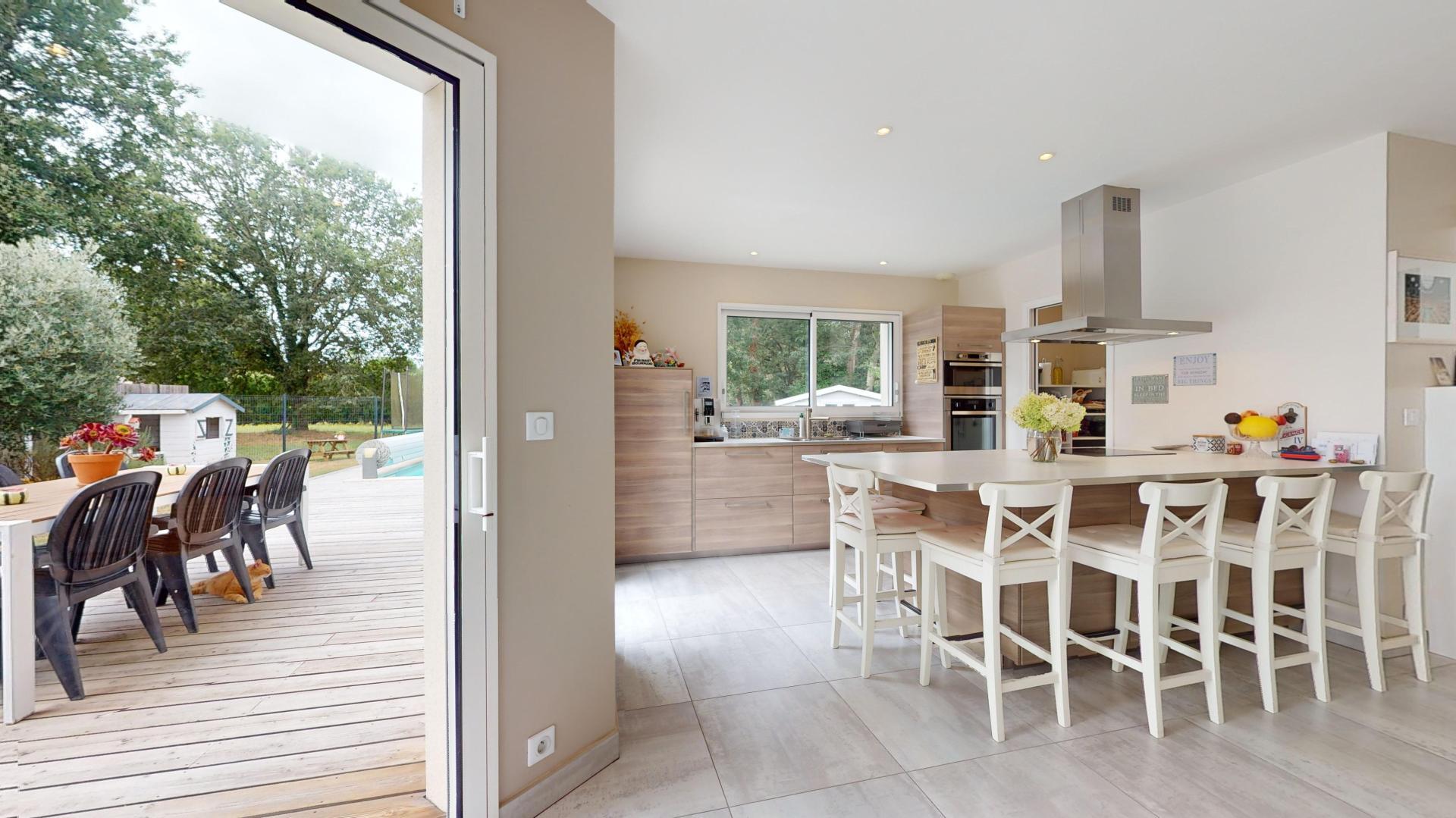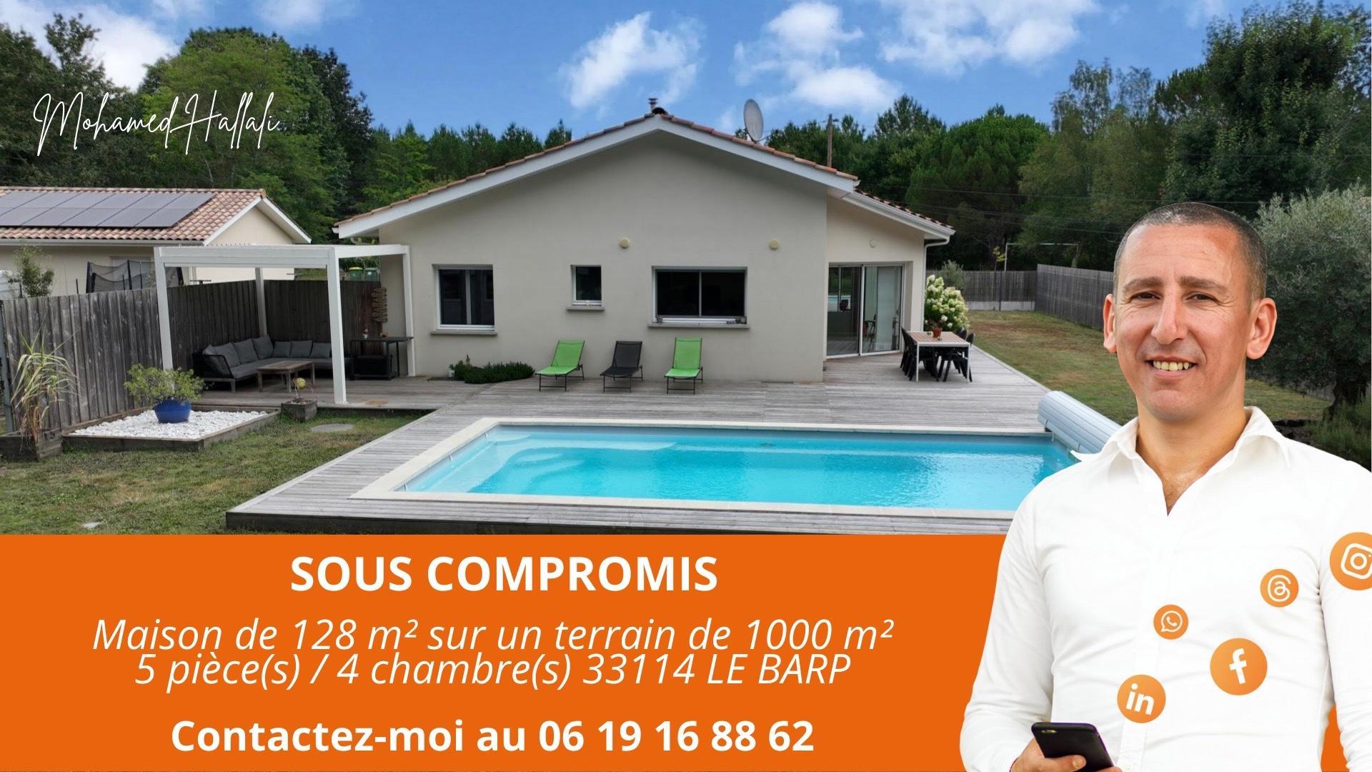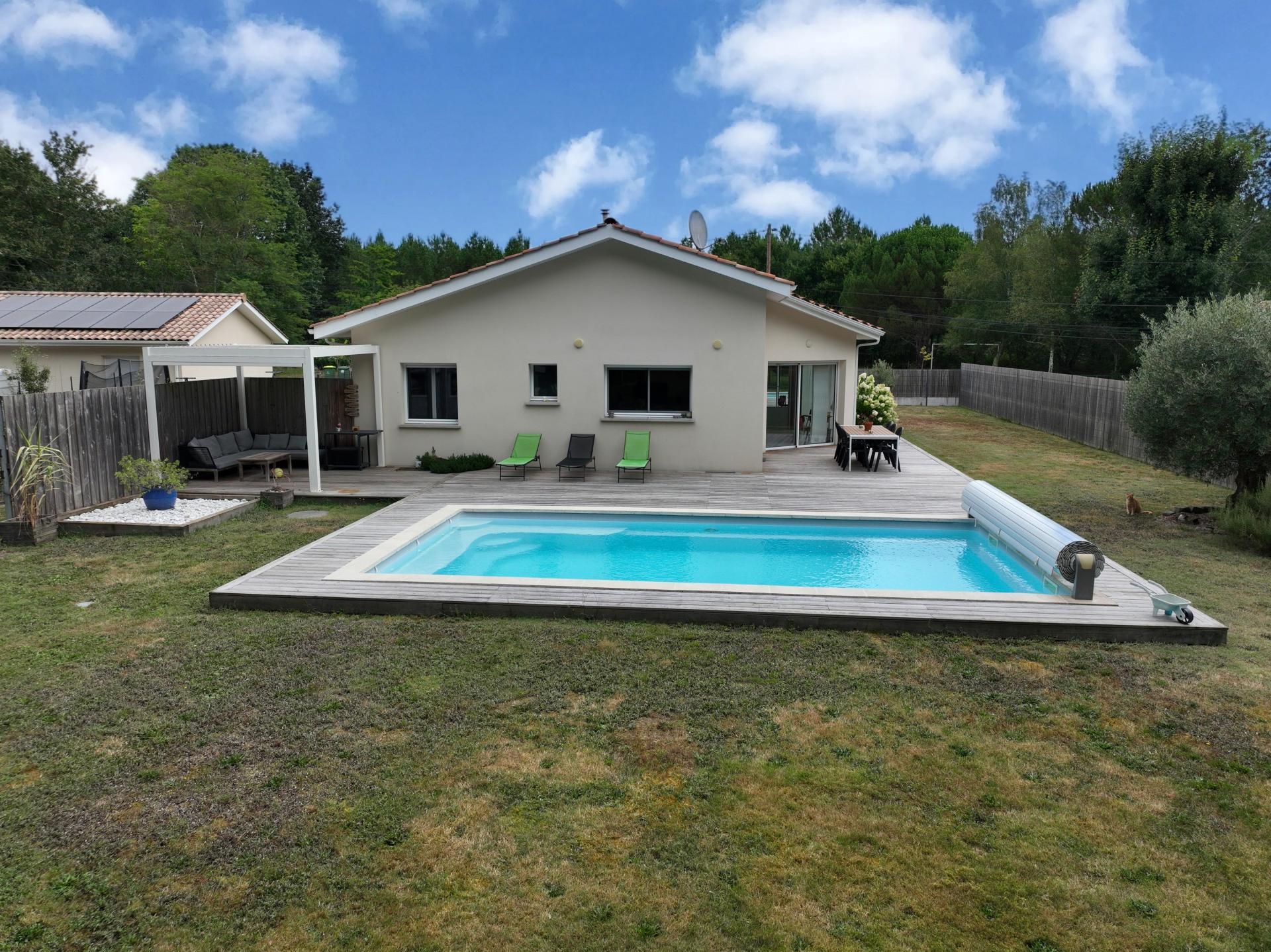 Située sur Le Barp, dans une environnement calme et verdoyant, en lisière d’une forêt, venez découvrir cette maison récente de 128 m2. Construite de plain pied sur une parcelle de 1000 m2, la maison bénéficie également d’un grand parking, d’une piscine, d’un abri jardin et d’une grande terrasse. L’intérieur se compose d’une entrée, un grand séjour lumineux, une cuisine ouverte avec son cellier attenant, 4 chambres dont une avec un grand dressing, une buanderie, un WC et une salle de bain. Aucun travaux à prévoir.