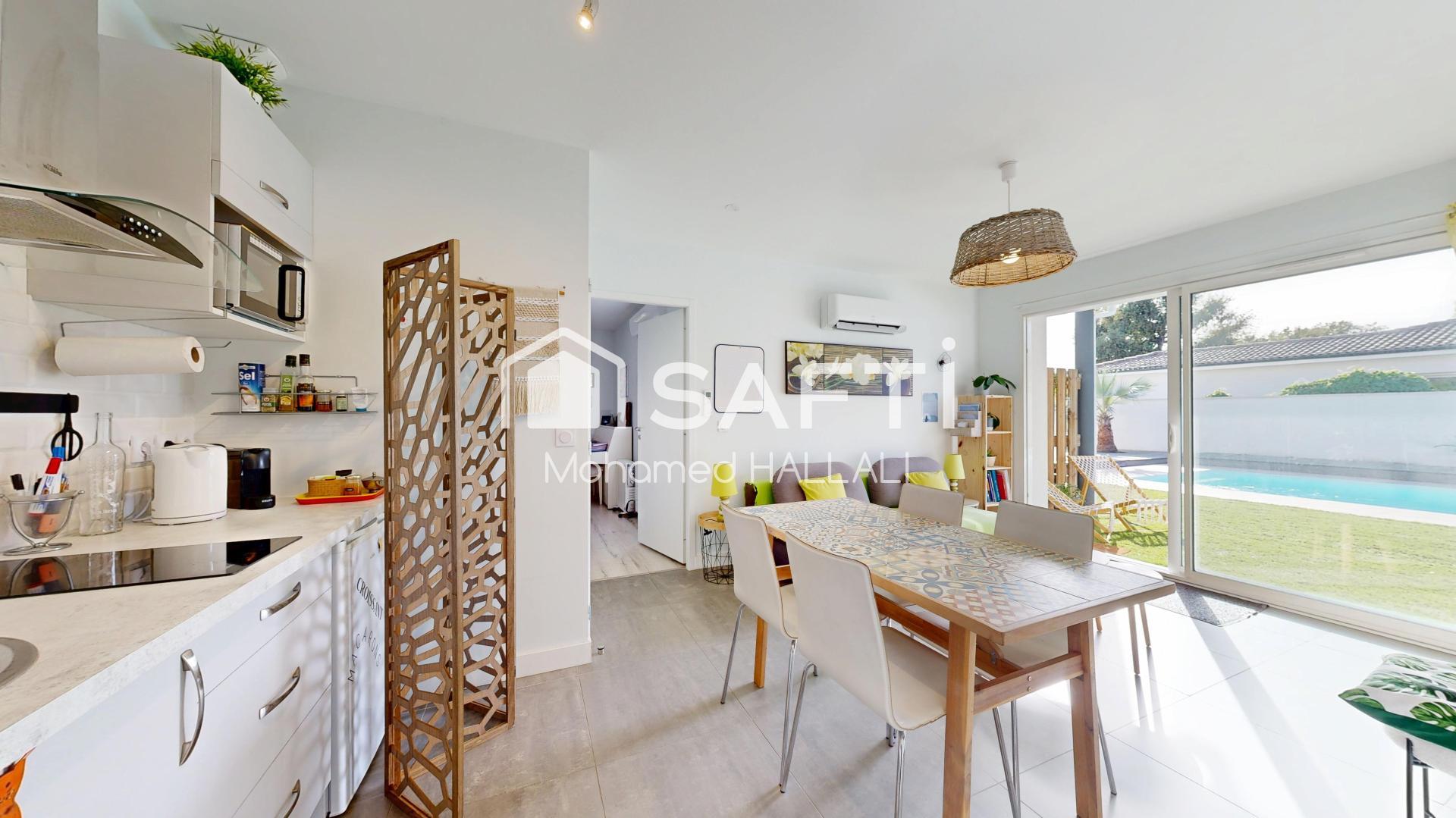 Dans un quartier résidentiel très calme, à deux pas des commerces et des écoles, accessibles à pied, cette adresse offre un cadre de vie serein et pratique. Les extérieurs prolongent le confort : jardin intimiste, terrasse couverte pour recevoir, piscine et spa pour se détendre, parking privatif. À l’intérieur, la villa de 167 m² déploie des volumes fluides : au rez-de-chaussée, entrée, séjour lumineux, cuisine ouverte sur salle à manger, cellier/buanderie, deux chambres, salle d’eau et WC. Attenant, un T3 entièrement indépendant (accès dédié) avec séjour/cuisine, deux chambres, salle d’eau et WC, idéal pour accueillir ou optimiser des revenus. À l’étage, un bureau pour télétravail et une suite parentale avec dressing, salle d’eau et terrasse. Points forts : indépendance du T3, circulation efficace, quartier recherché, garanties décennale et dommages ouvrage. Bien rare sur le secteur. Contactez-moi pour dossier complet et visite privée.